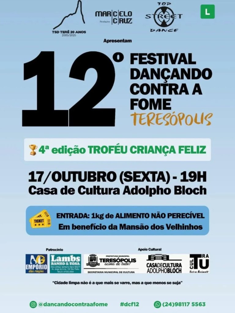 12° Festival Dançando Contra a Fome em Teresópolis, que vai acontecer dia 17 de outubro de 2025, sexta-feira, às 19h na Casa de Cultura Adolpho Bloch,em Araras Teresópolis RJ; com direção de Marcelo Cruz