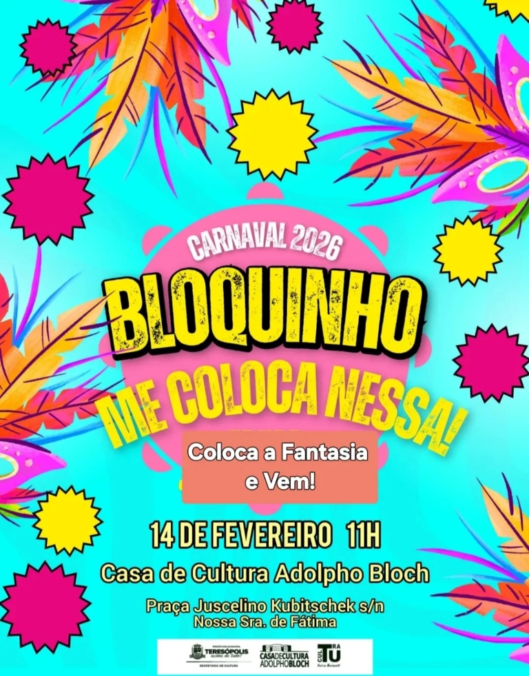 Neste sábado, dia 14, a Casa de Cultura Adolpho Bloch realiza o desfile do recém-criado Bloquinho “Me coloca nessa!”, a partir das 11h. Formado por professores, funcionários, alunos, familiares e visitantes, o grupo promete agitar a Praça Juscelino Kubitschek e seu entorno, com alegria e samba no pé.