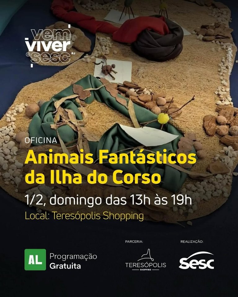 Dia 01/02/2026 (dom)- das 13 às 17h Oficina Animais Fantásticos da Ilha do Corso no Teresópolis Shopping Center parceria com Sesc Teresópolis RJ