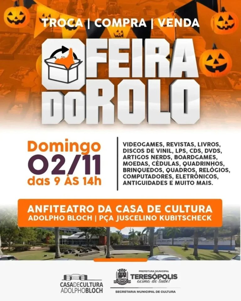 Dia 02/11/2025 (dom)- das 9 às 14h Feira do Rolo no anfiteatro da Casa de Cultura Adolpho Bloch em Teresópolis RJ