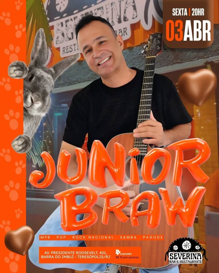 agenda culturalculturadestaqueseventosmúsicaserra cariocatereteresopolis Dia 03-04 Junior Braw no Severina Teresópolis 1 de abril de 2026 tere_total Dia 03-04 Junior Braw no Severina Teresópolis Dia 03/04/2026 (sex)- 20h Junior Braw no Severina Bar e restaurante em Teresópolis RJ Endereço: Av. Presidente Roosevelt, 401 Barra do Imbuí Fonte: Severina Bar e restaurante