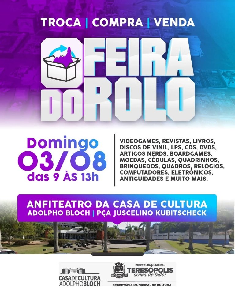 Dia 03/08/2025 (dom)- das 9 às 13h Feira do Rolo no anfiteatro da Casa de Cultura Adolpho Bloch em Teresópolis RJ
