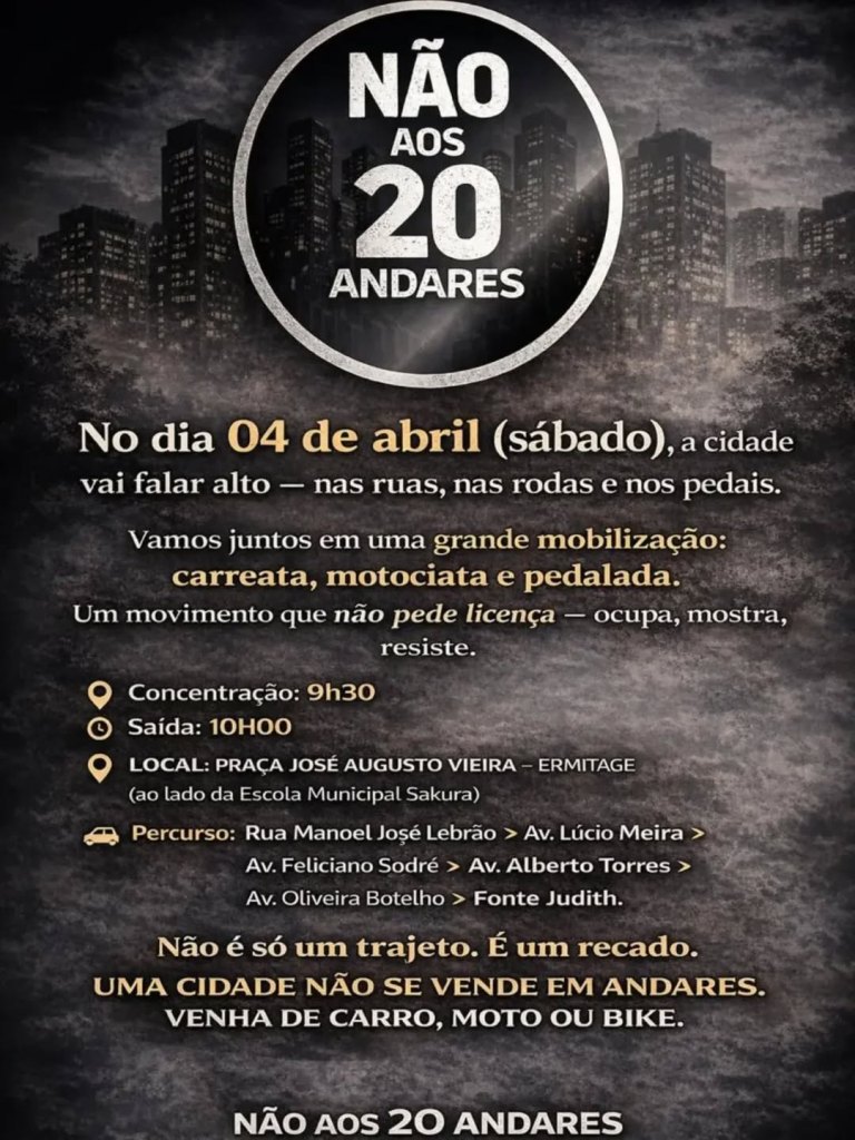 Dia 04/04/2026 (sáb)- 9h30 Não aos 20 andares nas ruas de Teresópolis RJ. Um protesto pacífico! Carreata, motociata e pedalada