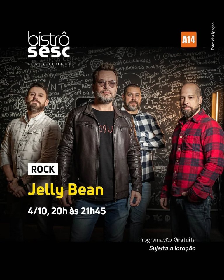 Dia 04/10/2025 (sáb)- das 20 às 21h45 Jelly Bean (rock) no Sesc Bistrô em Teresópolis RJ