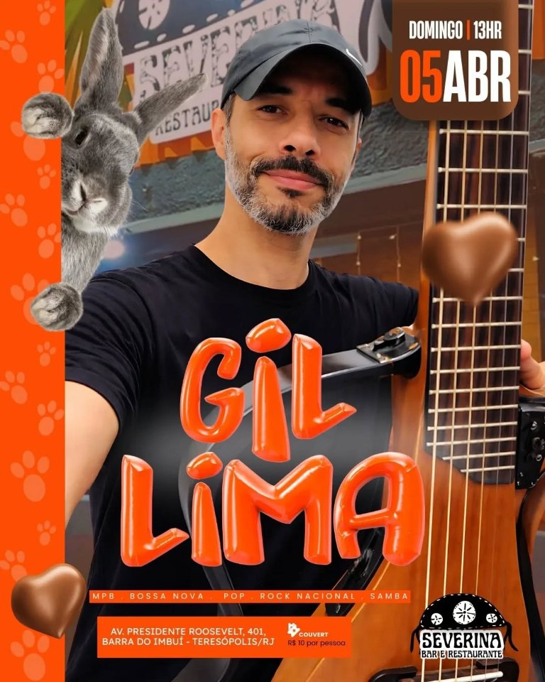 agenda culturalmúsicaserra cariocatereteresopolis Dia 05-04 Gil Lima no Severina Teresópolis 1 de abril de 2026 tere_total Dia 05-04 Gil Lima no Severina Teresópolis Dia 05/04/2026 (dom)- 13h Gil Lima no Severina Bar e restaurante em Teresópolis RJ Endereço: Av. Presidente Roosevelt, 401 Barra do Imbuí Fonte: Severina Bar e restaurante