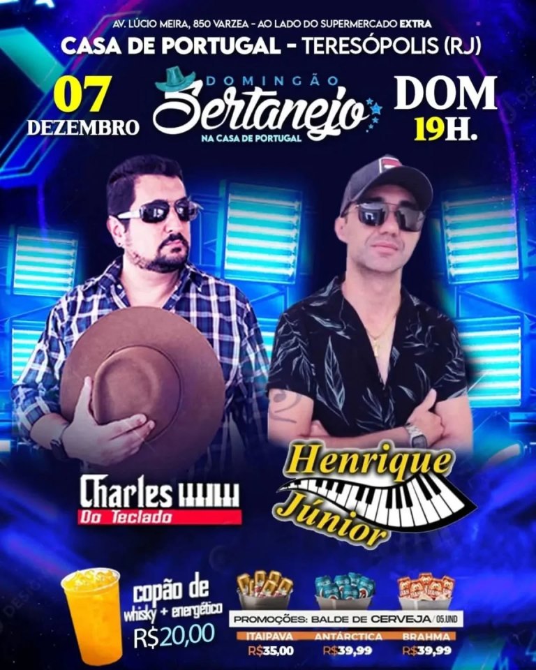 Dia 07/12/2025 (dom)- 19h- Domingão Sertanejo com Charles do Teclado e Henrique Junior na Casa de Portugal de Teresópolis RJ