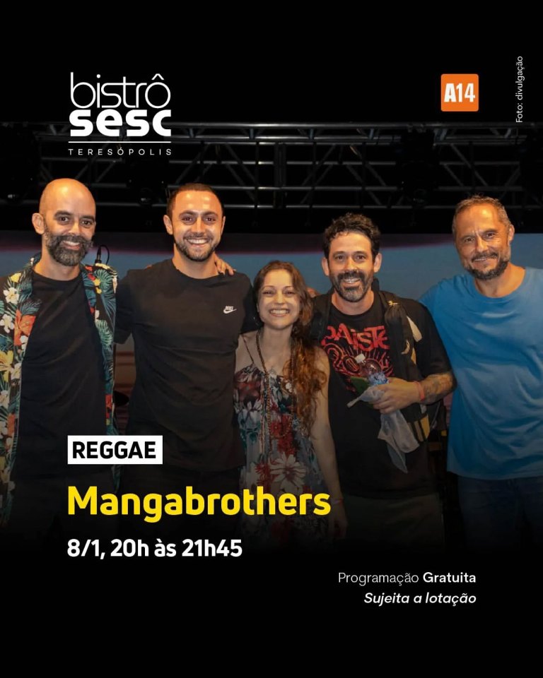 agenda culturalculturadestaqueseventosmúsicaserra cariocaSesctereteresopolis Dia 08-01 Mangabrothers no Sesc Bistrô Teresópolis 6 de janeiro de 2026 tere_total Dia 08-01 Mangabrothers no Sesc Bistrô Teresópolis Dia 08/01/2026 (qui)- das 20 às 21h45 Mangabrothers (Reggae) no Sesc Bistrô em Teresópolis RJ Endereço: Av. Delfim Moreira, 749 – Várzea, Teresópolis – RJ Fonte: Sesc Teresópolis