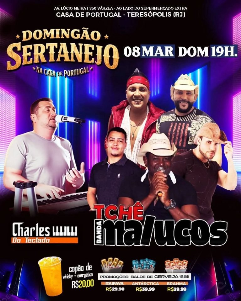Dia 08/03/2026 (dom)- 19h- Domingão Sertanejo com Charles do Teclado e a banda Tchê Malucos na Casa de Portugal de Teresópolis RJ