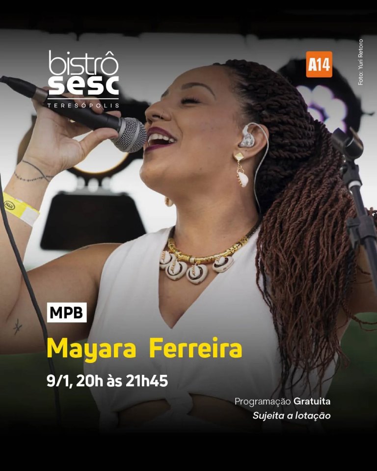 agenda culturalculturadestaqueseventosmúsicaserra cariocaSesctereteresopolis Dia 09-01 Mayara Ferreira no Sesc Bistrô Teresópolis 6 de janeiro de 2026 tere_total Dia 09-01 Mayara Ferreira no Sesc Bistrô Teresópolis Dia 09/01/2026 (sex)- das 20 às 21h45 Mayara Ferreira (MPB) no Sesc Bistrô em Teresópolis RJ Endereço: Av. Delfim Moreira, 749 – Várzea, Teresópolis – RJ Fonte: Sesc Teresópolis