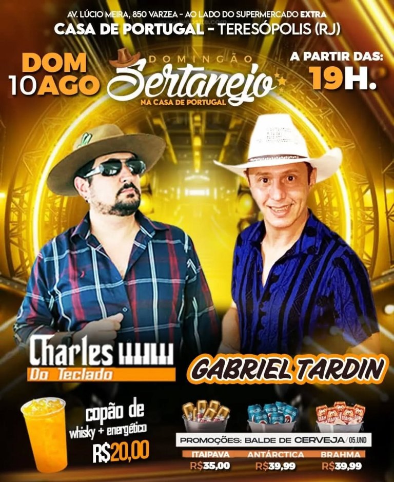 Dia 10/08/2025 (dom)- 19h- Domingão Sertanejo com Charles do Teclado e Gabriel Tardin na Casa de Portugal de Teresópolis RJ