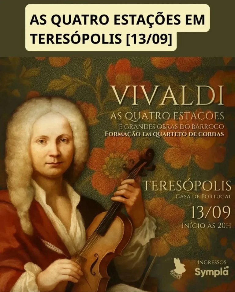 Aos fãs de música de qualidade, dia 13 de setembro de 2025 , às 20h, chega na Casa de Portugal de Teresópolis o concerto para cordas de VIVALDI, AS QUATRO ESTAÇÕES, além de outras obras de grandes mestres do Barroco!