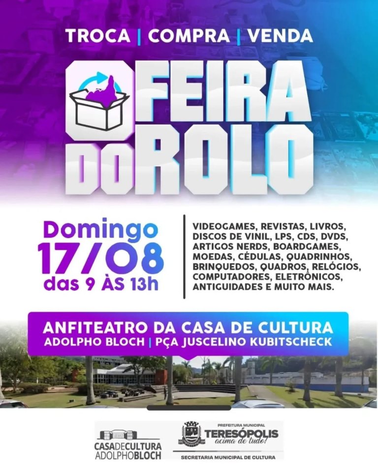 Dia 17/08/2025 (dom)- das 9 às 13h Feira do Rolo no anfiteatro da Casa de Cultura Adolpho Bloch em Teresópolis RJ
