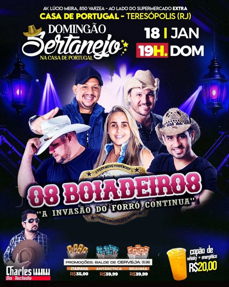 Dia 18/01/2026 (dom)- 19h- Domingão Sertanejo com Charles do Teclado e Os Boiadeiros na Casa de Portugal de Teresópolis RJ