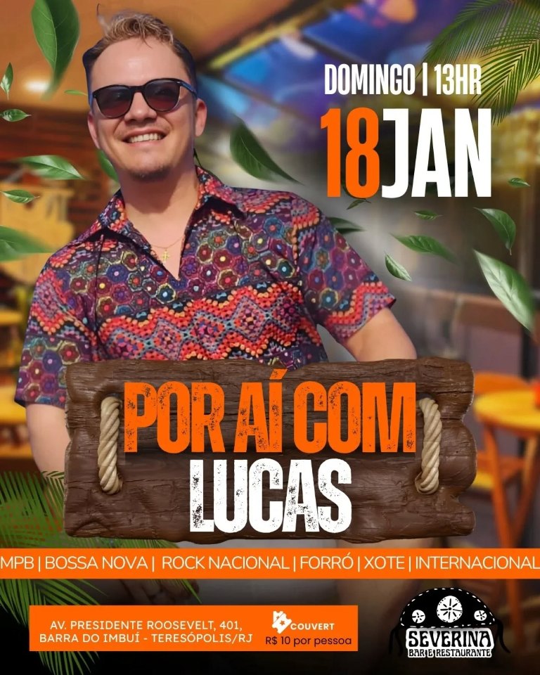 agenda culturalmúsicaserra cariocatereteresopolis Dia 18-01 Por aí com Lucas no Severina Teresópolis 14 de janeiro de 2026 tere_total Dia 18-01 Por aí com Lucas no Severina Teresópolis Dia 18/01/2026 (dom)- 13h Por aí com Lucas no Severina Bar e restaurante em Teresópolis RJ Endereço: Av. Presidente Roosevelt, 401 Barra do Imbuí Fonte: Severina Bar e restaurante