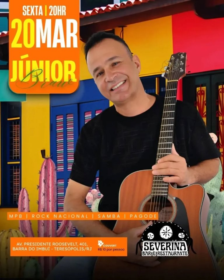 agenda culturalculturamúsicaserra cariocatereteresopolis Dia 20-03 Junior Braw no Severina Teresópolis 17 de março de 2026 tere_total Dia 20-03 Junior Braw no Severina Teresópolis Dia 20/03/2026 (sex)- 20h Junior Braw no Severina Bar e restaurante em Teresópolis RJ Endereço: Av. Presidente Roosevelt, 401 Barra do Imbuí Fonte: Severina Bar e restaurante