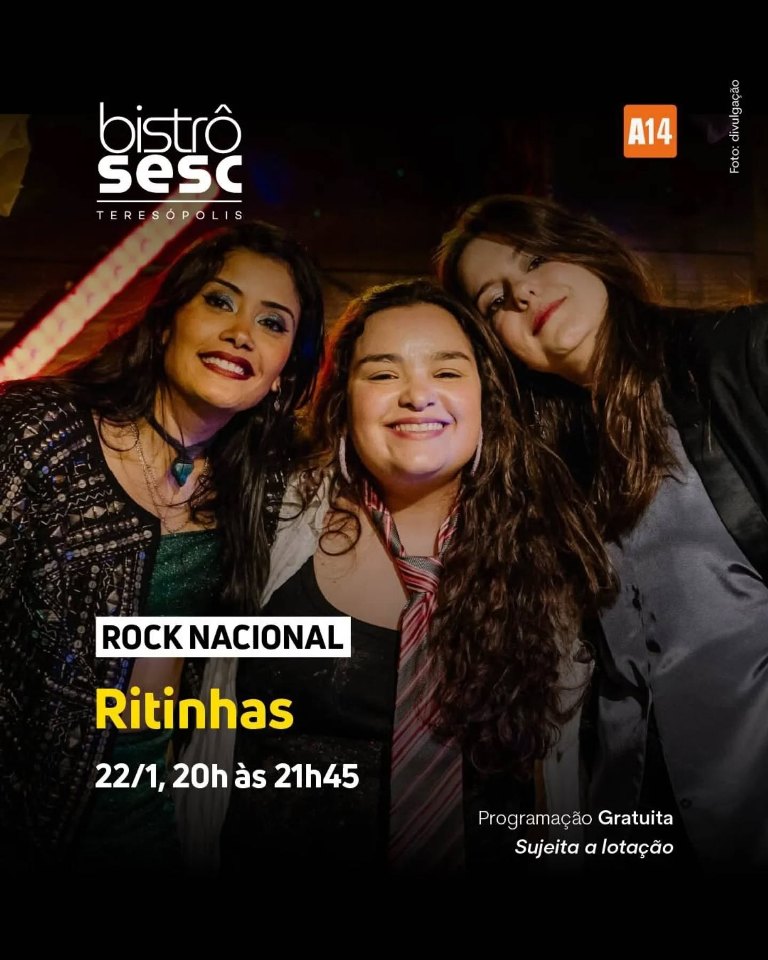 agenda culturalculturadestaqueseventosmúsicaserra cariocatereteresopolis Dia 22-01 Ritinhas no Sesc Bistrô Teresópolis 20 de janeiro de 2026 tere_total Dia 22-01 Ritinhas no Sesc Bistrô Teresópolis Dia 22/01/2026 (qui)- das 20 às 21h45 Ritinhas (Rock nacional) no Sesc Bistrô em Teresópolis RJ Endereço: Av. Delfim Moreira, 749 – Várzea, Teresópolis – RJ Fonte: Sesc Teresópolis