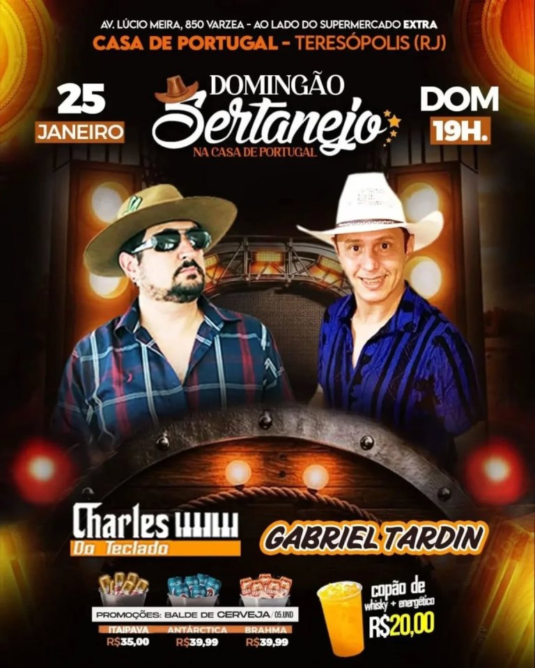 Dia 25/01/2026 (dom)- 19h- Domingão Sertanejo com Charles do Teclado e Gabriel Tardin na Casa de Portugal de Teresópolis RJ