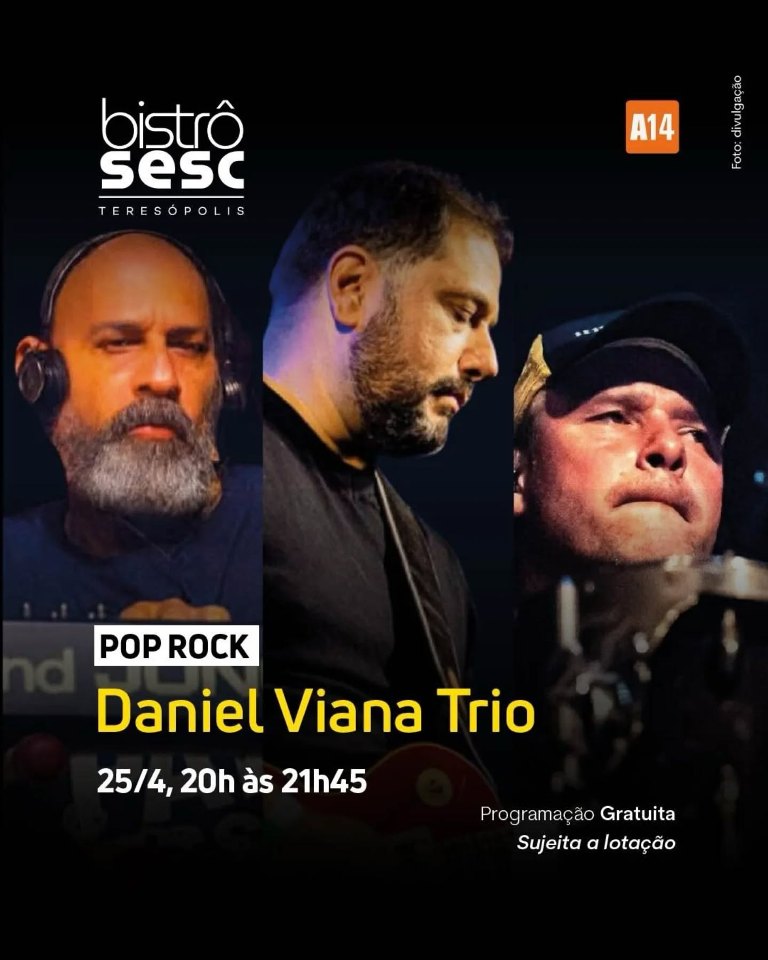 agenda culturalmúsicaserra cariocaSesctereteresopolis Dia 25-04 Daniel Viana Trio no Sesc Bistrô Teresópolis 21 de abril de 2026 tere_total Dia 25-04 Daniel Viana Trio no Sesc Bistrô Teresópolis Dia 25/04/2026 (sáb)- das 20 às 21h45 Daniel Viana Trio (pop rock) no Sesc Teresópolis RJ Endereço: Av. Delfim Moreira, 749 – Várzea, Teresópolis – RJ Fonte: Sesc Teresópolis