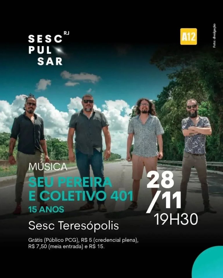 Dia 28/11/2025 (sex)- 19h30- música – Seu Pereira e o Coletivo 401 (15 anos) no Sesc Teresópolis RJ