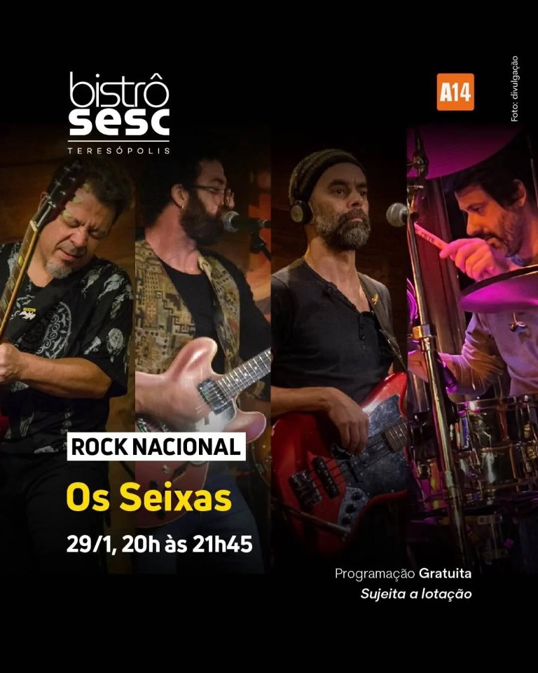 agenda culturalculturadestaqueseventosmúsicaserra cariocaSesctereteresopolis Dia 29-01 Os Seixas no Sesc Bistrô Teresópolis 27 de janeiro de 2026 tere_total Dia 29-01 Os Seixas no Sesc Bistrô Teresópolis Dia 29/01/2026 (qui)- das 20 às 21h45 Os Seixas (Rock nacional) no Sesc Bistrô em Teresópolis RJ Endereço: Av. Delfim Moreira, 749 – Várzea, Teresópolis – RJ Fonte: Sesc Teresópolis