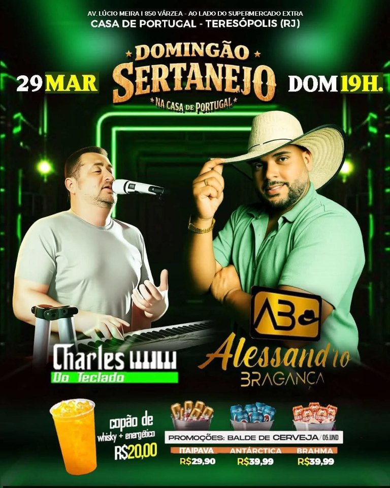 Dia 29/03/2026 (dom)- 19h- Domingão Sertanejo com Charles do Teclado e Alessandro Bragança & Banda na Casa de Portugal de Teresópolis RJ