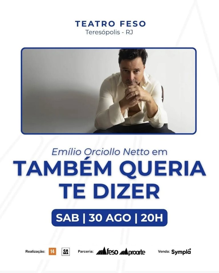 Dia 30/08/2025 (sáb)-20h Emílio Orciollo Netto em Também Queria te Dizer no teatro Feso em Teresópolis RJ