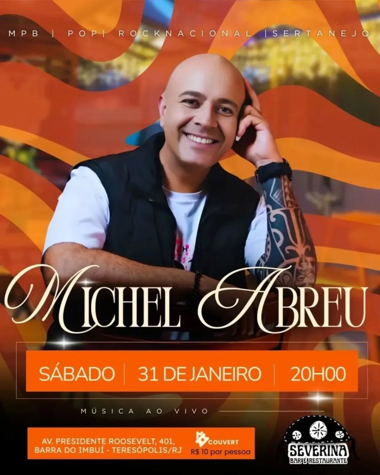 agenda culturalculturadestaqueseventosmúsicaserra cariocatereteresopolis Dia 31-01 Michel Abreu no Severina Teresópolis 29 de janeiro de 2026 tere_total Dia 31-01 Michel Abreu no Severina Teresópolis Dia 31/01/2026 (sáb)- 20h Michel Abreu no Severina Bar e restaurante em Teresópolis RJ Endereço: Av. Presidente Roosevelt, 401 Barra do Imbuí Fonte: Severina Bar e restaurante