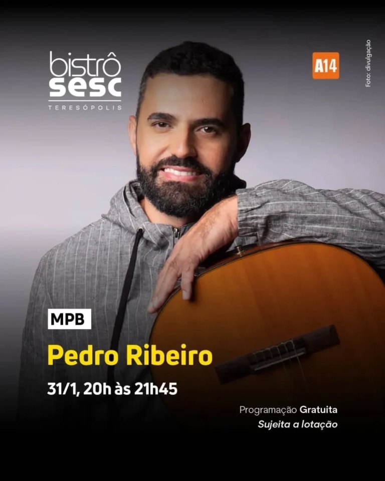 agenda culturalculturadestaqueseventosserra cariocaSesctereteresopolis Dia 31-01 Pedro Ribeiro no Sesc Bistrô Teresópolis 29 de janeiro de 2026 tere_total Dia 31-01 Pedro Ribeiro no Sesc Bistrô Teresópolis Dia 31/01/2026 (sáb)- das 20 às 21h45 Pedro Ribeiro (MPB) no Sesc Bistrô em Teresópolis RJ Endereço: Av. Delfim Moreira, 749 – Várzea, Teresópolis – RJ Fonte: Sesc Teresópolis