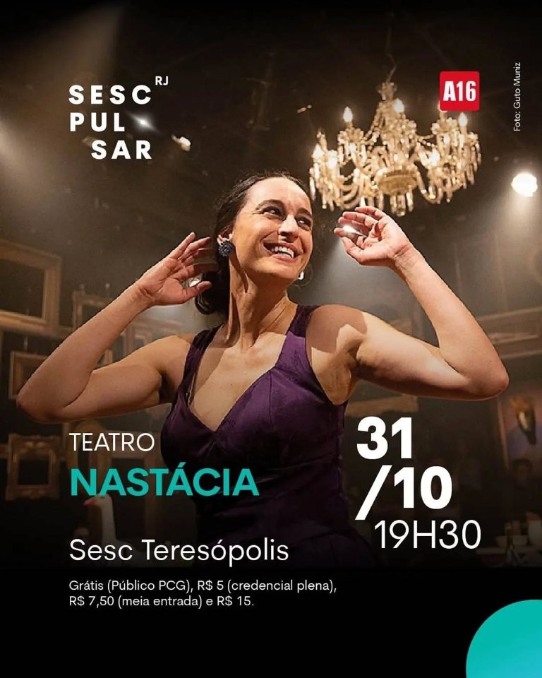 agenda culturalculturadestaqueseventosserra cariocaSescteatrotereteresopolis Dia 31-10 Nastácia no Sesc Teresópolis 27 de outubro de 2025 tere_total Dia 31-10 Nastácia no Sesc Teresópolis Dia 31/10/2025 (sex)- 19h30- teatro – Nastácia no Sesc Teresópolis RJ Endereço: Av. Delfim Moreira, 749 – Várzea, Teresópolis – RJ Fonte: Sesc Teresópolis