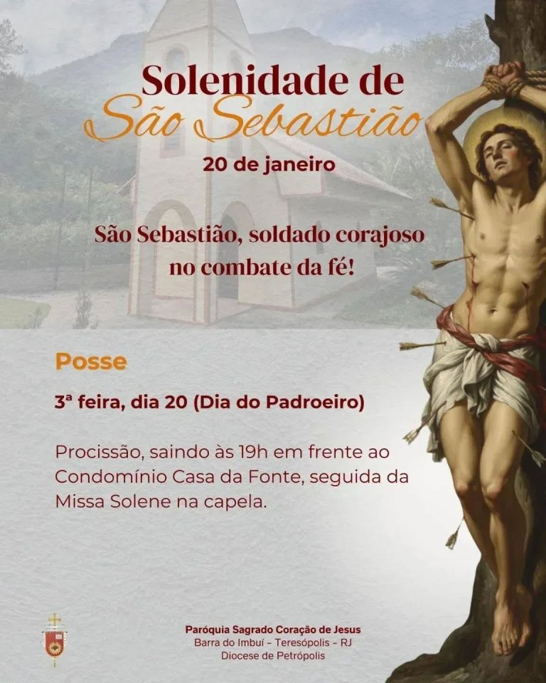 Dia 20/01/2026 (ter)-19h- Dia de São Sebastião em Teresópolis com procissão e logo após missa na capelinha da Posse. Venha orar! Padroeiro da cidade do Rio de Janeiro