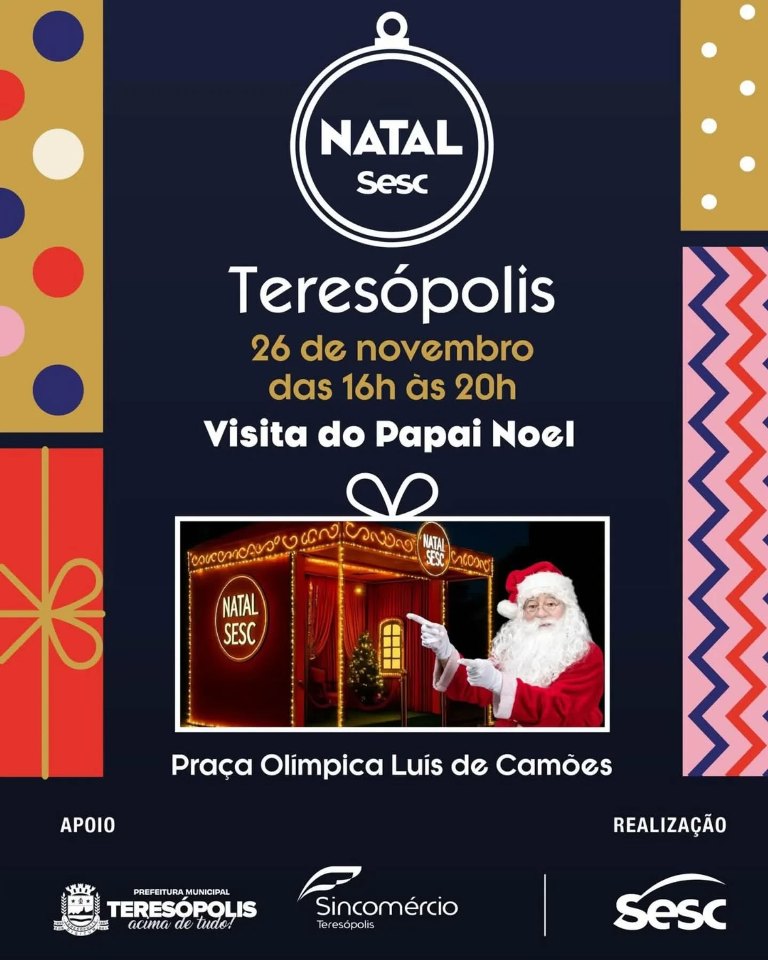 Dia 26/11/2025 (qua)-das 16 às 20h Visita do Papai Noel na Praça Olímpica em Teresópolis